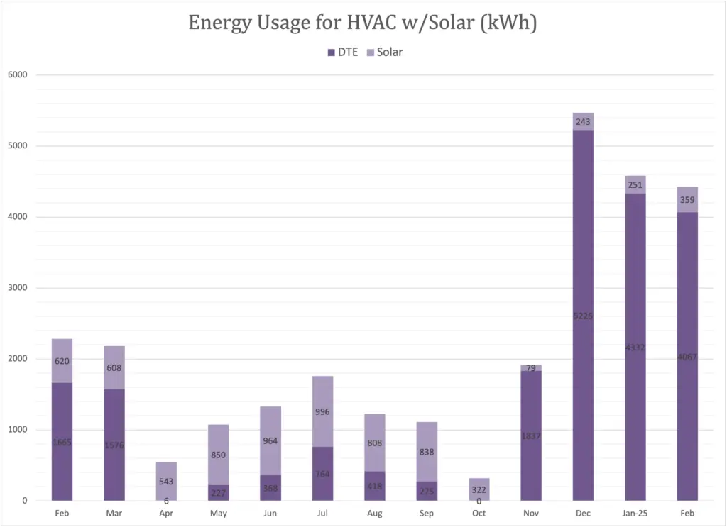 We examine our energy usage for HVAC equipment and other electrical equipment, monitor the kWh produced by our solar panels, and track our costs. See our Energy – Electrical Usage Statistics page for more details.
