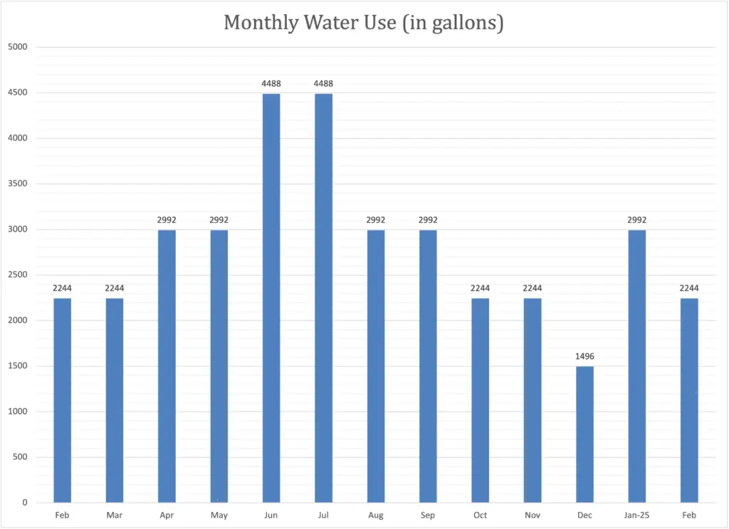 A look at our monthly water usage in gallons, costs, and comparison to industry standard. See our Water Usage Statistics page for more details.